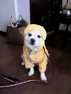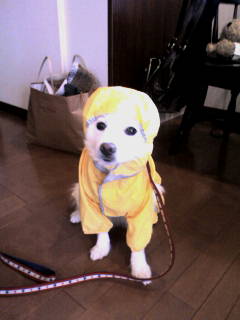 今日ちょうど雨だったので、早速レインコート出勤させよう!!と
